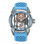 This Epic X Titanium Skeleton offers a refreshing take on Jacob & Co.’s signature skeletonised architecture. Framed by a lightweight 44mm titanium case, the design centres around the iconic X-shaped structure—visible through both the front and transparent caseback—fusing case and calibre in one unified, architectural composition. Powered by the manual-winding JCAM02 movement, the open dial showcases a stunning interplay of negative space and mechanical form, enhanced by luminous hands and framed by a vibrant blue rubber strap. The sky blue accents add an unexpected softness to the otherwise bold and technical aesthetic. Balancing skeletonisation with wearability, this timepiece stands as a bold expression of transparency, structure, and Jacob & Co.’s unmistakable flair for design.