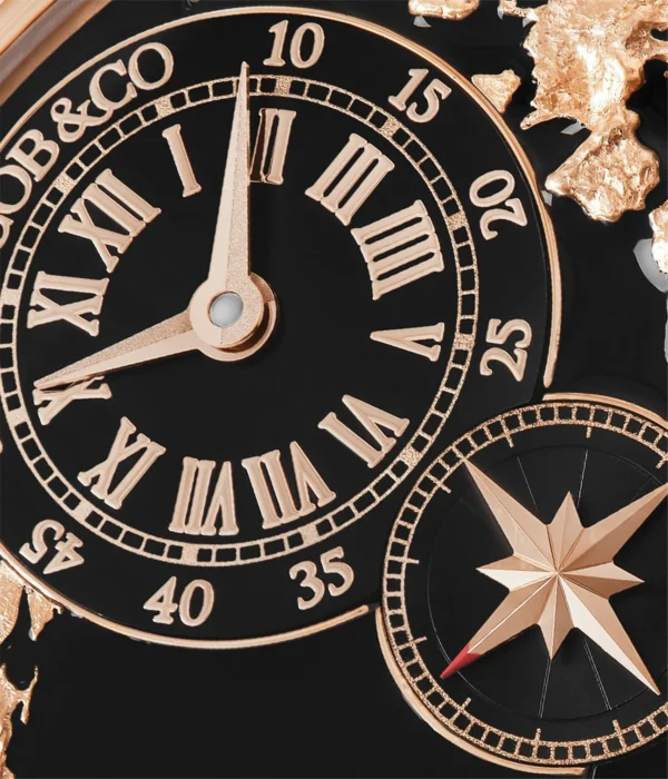 A deeply personal creation, The World Is Yours Dual Time Zone is a homage to the timepiece that first ignited Jacob Arabo’s watchmaking journey. Inspired by a vintage double-time zone watch gifted to him by his father, this 43mm piece blends emotional heritage with high horology. Crafted in 18K rose gold, the rounded case is topped by a dramatically curved sapphire crystal that reflects the globe-inspired contours of the dial. The black lacquered surface features a detailed rendering of the western hemisphere with rose gold-finished continents and a compass rose at the centre, requiring the hands to be mounted at a 12° incline for clarity across the domed dial. Inside ticks the self-winding JCAA11 calibre, which independently drives both time zones down to the minute—ideal for regions with unconventional UTC offsets, such as India. A rose gold caseback engraved with a world map completes the concept. Fitted on a black alligator leather strap with a matching rose gold pin buckle, this watch is a poetic intersection of personal memory and global vision.